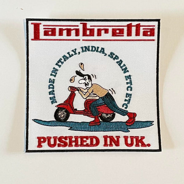 Lambretta Humour - 'Made in Italy, India, Spain, etc, etc....pushed in the UK' - Embroidered Patch
